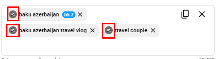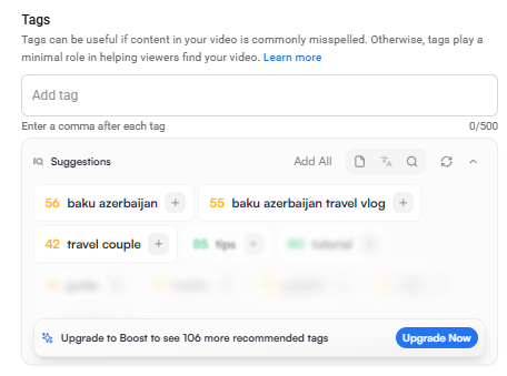 Before sharing the video on YouTube, since we wrote a travel-themed title, the vidIQ tool automatically analyzes the topic of our video and suggests appropriate keywords that we can use. By clicking the “+” sign next to the required keyword once, we can easily add that keyword to the tags list.