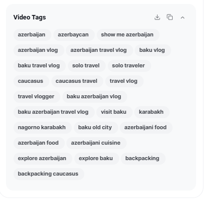 Up to this part of the lesson, we only did research. Now we will use the information we obtained. I recommend using three to four, maximum five keywords in the title and description. Adding more keywords may look like spam. Using keywords naturally within sentences rather than just as a list is more effective. For example, if the video we want to share is a vlog about “Azerbaijan travel,” our main keywords will be “Azerbaijan,” “travel,” and “vlog.” Using these keywords, we can construct the title as follows: