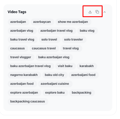 In the section where the keywords are located, it is possible to download the keywords as a CSV file by clicking the arrow icon at the top once. However, this function is active only in the vidIQ Premium version. If you are not using the Premium version, you cannot benefit from this opportunity. To get the vidIQ Premium version, click here. The Premium version offers more time-saving shortcuts of this kind. If you are using the free version, you can copy all keywords in bulk by clicking the copy icon next to the arrow icon once.