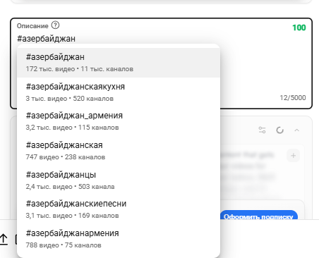 После ввода ключевого слова можно увидеть, какие хэштеги существуют, и сколько каналов и видео их используют. Отсюда можно выбрать подходящие и популярные хэштеги. Однако хэштеги, которые не соответствуют теме вашего видео и выбраны только из-за частого использования, не принесут реальной пользы. Поэтому используйте только хэштеги, напрямую связанные с темой видео.