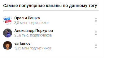 Показывает канал с наибольшим количеством использования этого ключевого слова и с высокой аудиторией подписчиков. С помощью этого показателя можно проводить анализ конкурентов.