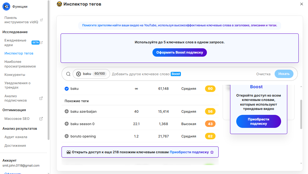 После добавления ключевого слова в теги, нажав на кнопку vidIQ рядом с ним один раз, можно увидеть другие ключевые слова, связанные с этим.