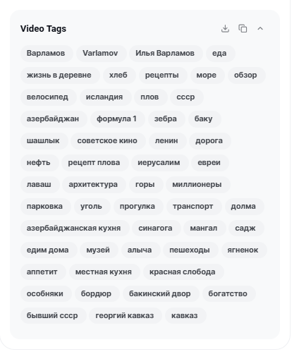 Ключевые слова можно получать не только из тегов вашего видео, но и из тегов видео каналов-конкурентов. Для этого нужно посмотреть подходящие видео на каналах конкурентов. На панели vidIQ справа от видео вы увидите, какие ключевые слова использованы в тегах этого видео.