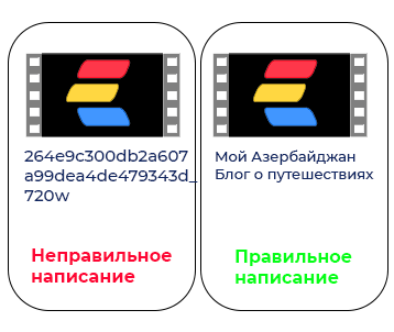После монтажа видео сохранять его под случайными именами, например «video1.mp4», неправильно. Перед загрузкой на YouTube обязательно измените название и используйте ключевые слова, соответствующие содержанию. Это поможет алгоритму платформы правильно понять тему вашего видео и увеличит вероятность его показа правильной аудитории. На следующем изображении приведены примеры неправильного и правильного именования видео.